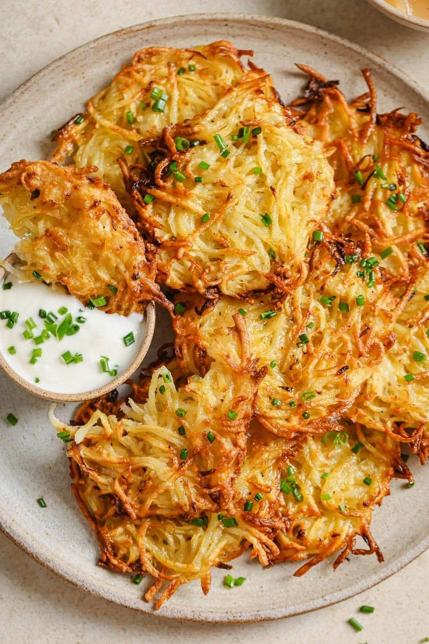 - Serve immediately, topped with a dollop of sour cream and a sprinkle of fresh chives. The cool, tangy cream balances the warm, crispy latke, while the chives add a fresh burst of flavor. Pair with a crisp green salad or a light soup for a complete meal.
