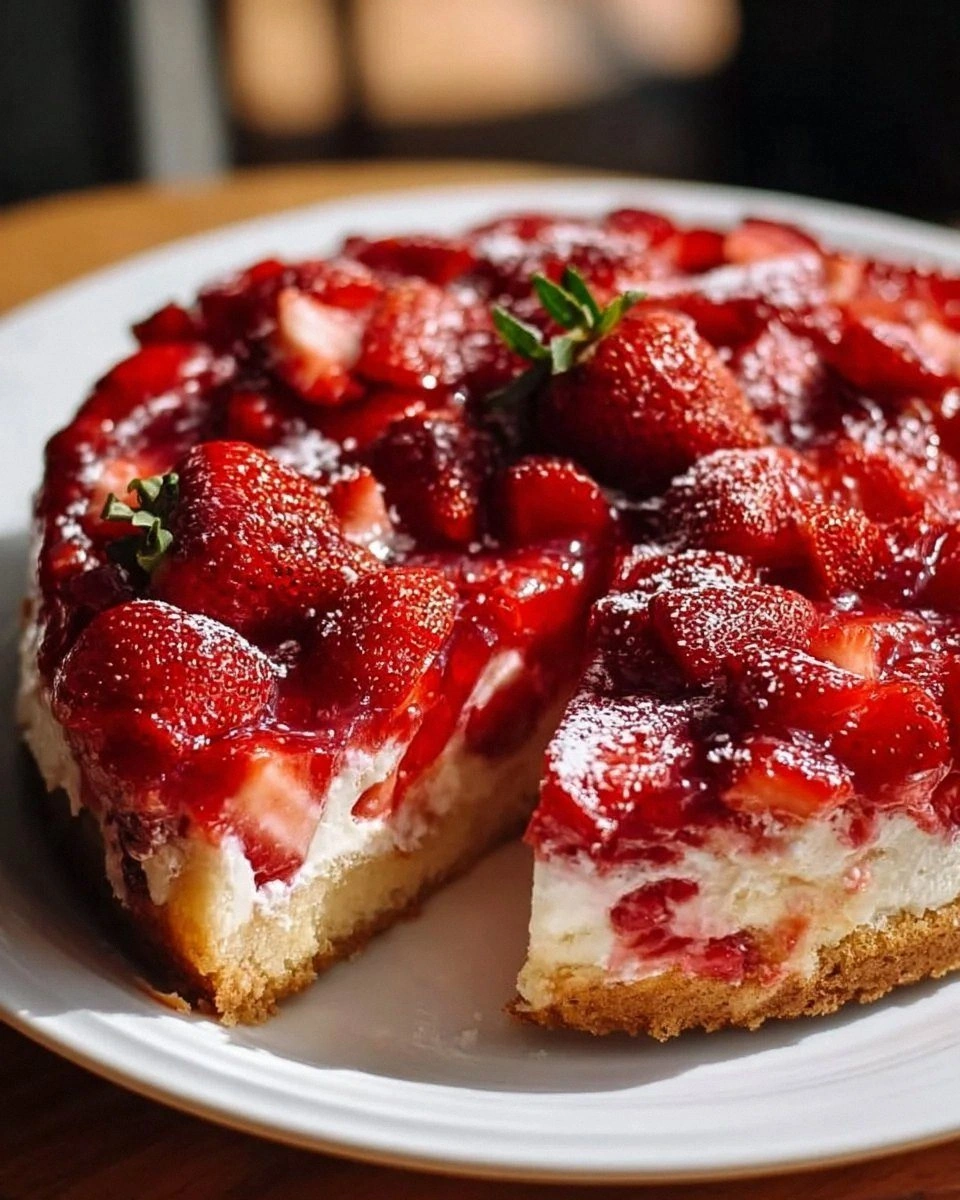 Picture this: the oven door swings open, releasing a wave of buttery vanilla aroma that instantly makes your nose do a happy dance. The top of the cake is a glossy, ruby‑red carpet of strawberry‑laden cheesecake, speckled with tiny bubbles that promise a melt‑in‑your‑mouth texture. The edges are crisp, caramelized just enough to crack under the fork like a delicate, sugary shell, while the center stays luxuriously soft, almost like a cloud you can scoop. When you cut into it, the strawberry sauce oozes out, painting the plate in a blush‑pink ribbon that looks too pretty to eat—yet you will, because it’s that good.