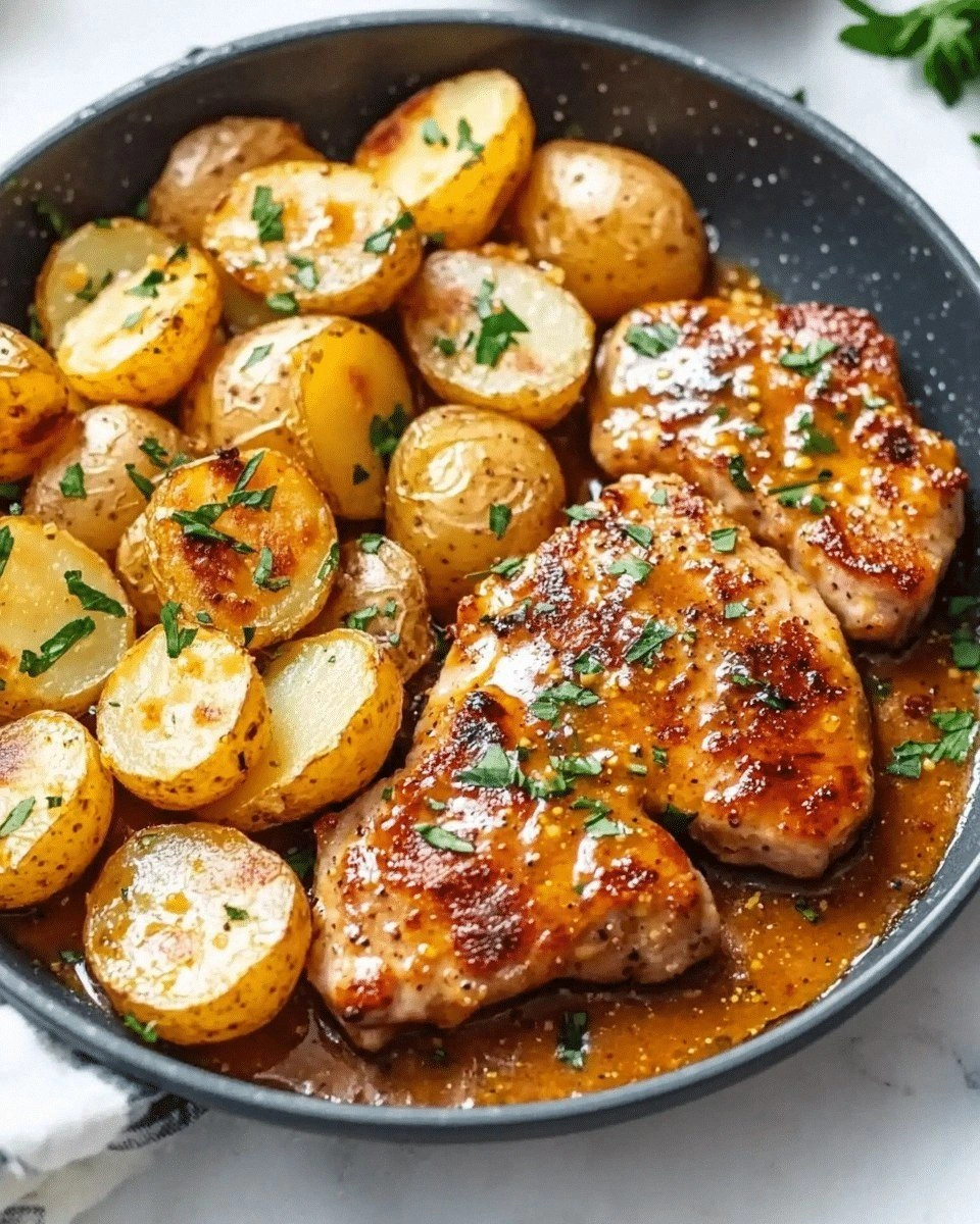 What sets this version apart from every other honey mustard pork chop recipe you’ve stumbled upon is the meticulous layering of flavors and the intentional use of a simple, yet powerful, glaze that caramelizes perfectly. I discovered that the secret lies in the ratio of honey to mustard and the timing of adding butter, which gives the sauce a silky sheen and a depth of flavor that feels both luxurious and approachable. The potatoes are tossed in a bright, herb-infused oil that gives them a buttery crunch while keeping them tender on the inside. The result is a dish that feels like a comforting hug wrapped in a glossy, savory blanket.