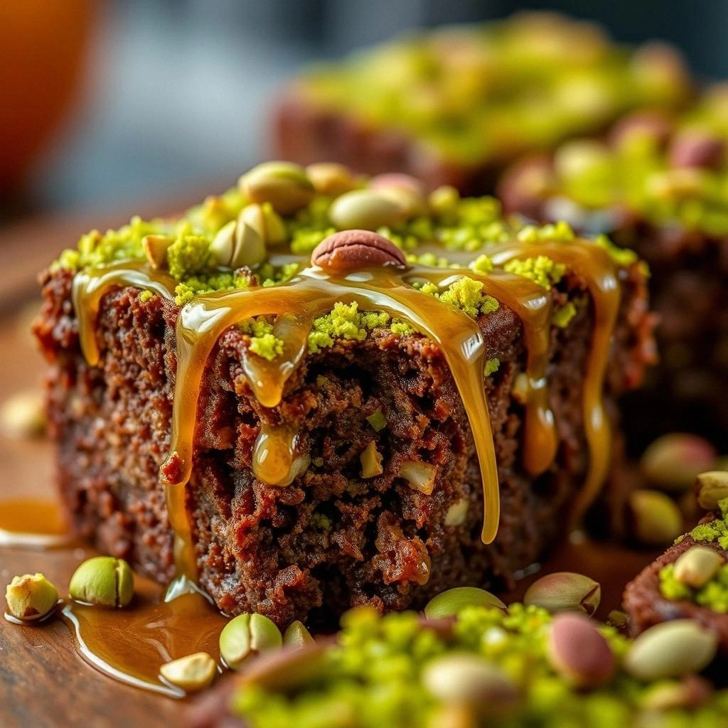 For the syrup, granulated sugar dissolves cleaner than honey, letting you control viscosity; add a squeeze of lemon to prevent crystallization and brighten the orange-blossom note. Once the brownie is out of the oven, let it cool for exactly five minutes before glazing—hot cake will drink too much syrup and collapse, while a stone-cold one repels it like Teflon. Finish with a snowfall of finely chopped pistachios; the finer the dust, the greener the jewel-tone contrast against the chocolate. Coarse pieces look rustic but roll off like pebbles, so channel your inner barista and aim for espresso-grind fineness.