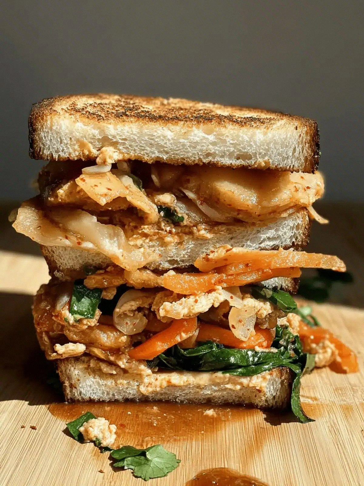 Picture the first bite: the bread is crisp on the outside, buttery, and the interior is a riot of colors—deep green spinach, earthy oyster mushrooms, and the fiery splash of kimchi. The aroma is a heady mix of toasted sesame, fermented tang, and a whisper of smoky tempeh. The texture is a delightful contrast: crunchy edges, tender fillings, and a creamy layer of vegan mayo that ties everything together. If you thought you’d never taste bibimbap in sandwich form, I dare you to taste this and not go back for seconds.