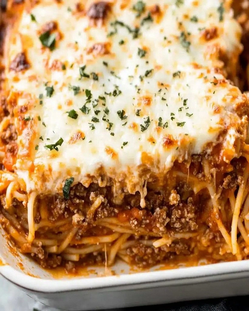 But the real kicker is texture: crispy, lacy edges that shatter like thin ice over a molten river of molten mozzarella, giving way to noodles that absorb every ounce of garlicky, beefy, creamy goodness. I dare you to taste this and not go back for seconds; I personally failed that challenge so hard I had to loosen my belt and still sneaked cold forkfuls from the fridge at midnight. If you have ever struggled with dry baked spaghetti that tastes like cafeteria mystery day, or versions swimming in grease that could lubricate a truck, you are not alone—and I have the fix.